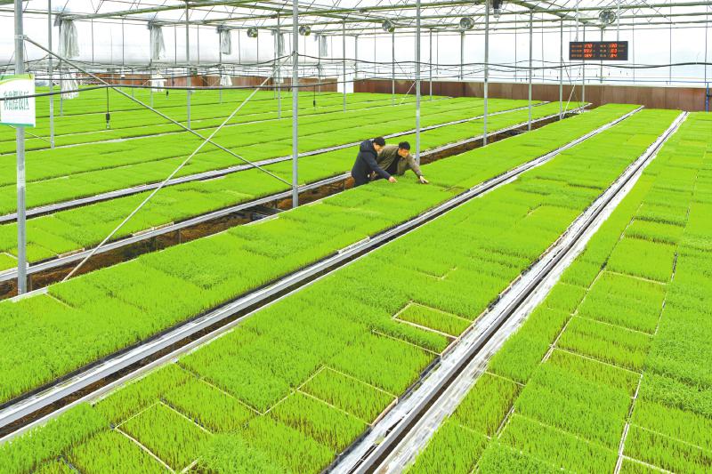 4月1日,工作人员在广安市广安区悦来镇灯塔村智能化育苗大棚查看水稻秧苗的生长情况,为4月中旬开展机插秧做好保障。 张国盛 摄