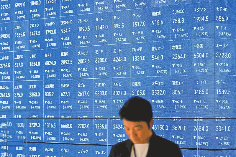 因投资者担忧美国“对等关税”导致全球经济衰退,日本东京股市7日全线下跌。图为4月7日一名男子站在日本东京的一处电子股指显示屏前。 新华社/法新