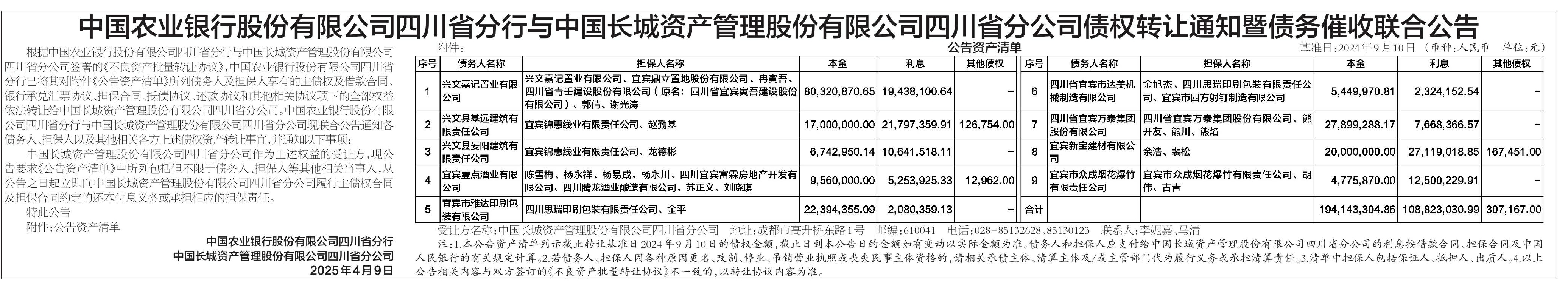 中国农业银行股份有限公司四川省分行与中国长城资产管理股份有限公司四川省分公司债权转让通知暨债务催收联合公告