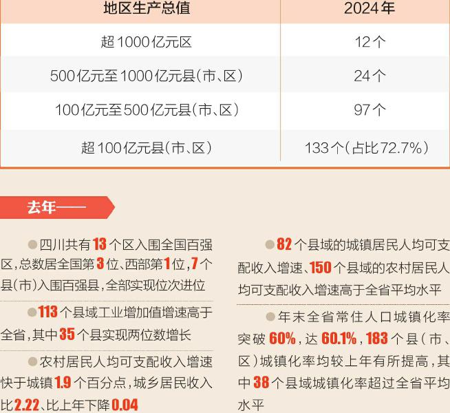 2024年,四川县域经济规模不断壮大。全省183个县(市、区)中,地区生产总值超100亿元的有133个,占比首次突破70%,达到72.7%。其中,有12个区地区生产总值超1000亿元,较2023年增加1个;地区生产总值在500亿元至1000亿元区间的县域有24个,较2023年增加3个;地区生产总值在100亿元至500亿元区间的县域有97个,较2023年增加4个。