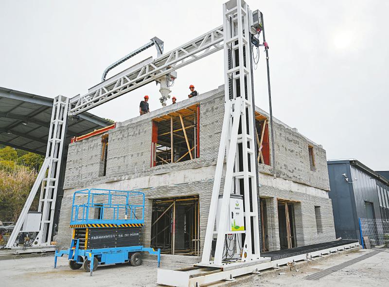 这是4月9日拍摄的3D打印机建设的双层小楼。近日,在湖北宜昌三峡大学3D打印研发基地试验场,一栋由学校自行研发的12米级龙门式建筑3D打印机建设的双层小楼实现封顶,比传统建造工期缩短约70%,打印的效率和完整性达到预期效果。 新华社记者 杜子璇 摄