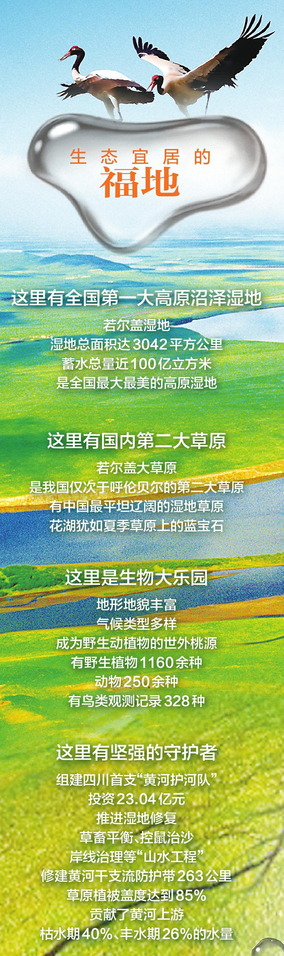 阿坝州若尔盖县,地处川甘青接合部、阿坝州北部,是四川通往西北省区的北大门,集若尔盖国家公园、黄河国家文化公园和长征国家文化公园于一身。 水是万物之源,更是若尔盖的灵魂。一滴水,衍生了世界上面积最大、保存最完整的高寒泥炭沼泽湿地,成就了世界上最奇特的“固体高原水库”,是长江、黄河上游重要的水源涵养区,是“中华水塔”的重要组成部分。 黄河之水从巴颜喀拉山奔腾而来,在这里留下唯一一个180度回头弯,造就了独特的黄河九曲第一湾景观,孕育了人与自然和谐相处、美美与共的生态家园。