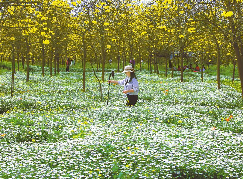 4月9日,成都市金堂县“金色春谷”的黄花风铃木和林间的菊花盛开,游客在花海中自拍。
