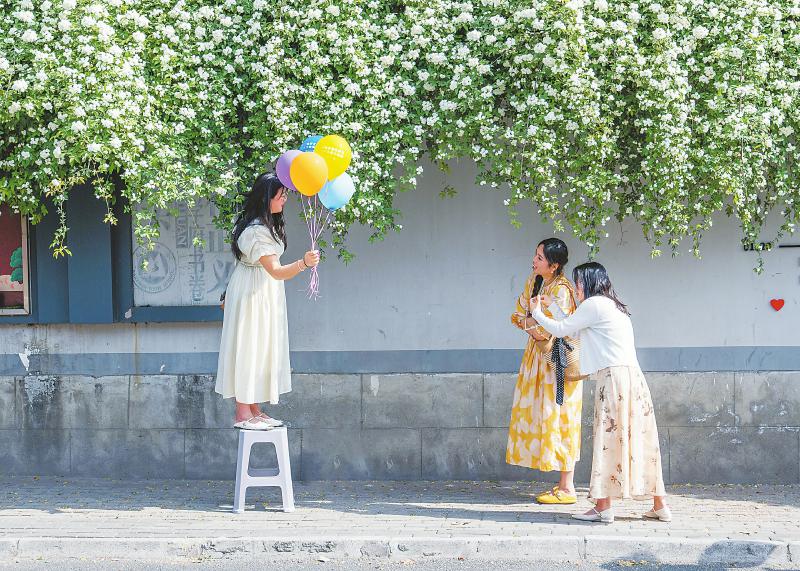 4月9日,游客在绵阳市南塔路盛开的七里香花下拍照打卡。