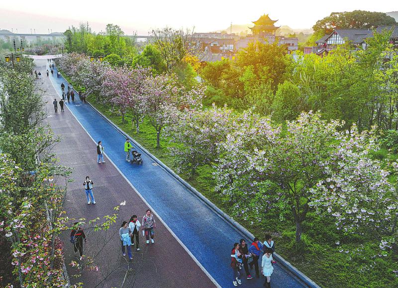 南充市蓬安县相如湖国家湿地公园的樱花跑道两旁千余株樱花竞相绽放,成为春日里一道亮丽的风景线。这条全长5200米的樱花跑道是当地在加强嘉陵江流域生态环境保护和修复的基础上,绿化、美化相如湖国家湿地公园的现有道路和防洪堤而建设的。每到春天,这里便成为市民游客的打卡地。