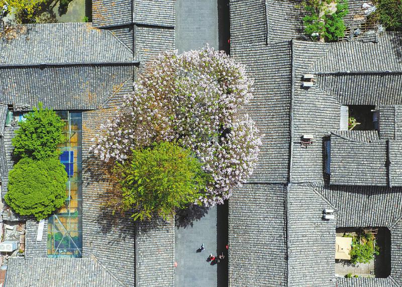 4月13日,俯瞰阆中市古城学道街一棵花开四散的梧桐树,形状如心,春意动人。