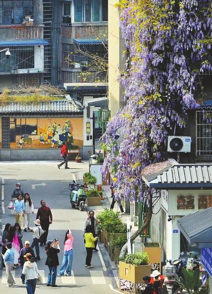 4月9日,成都市金牛区抚琴街南一巷,一株紫藤如瀑布般从一栋6层居民楼上“倾泻”而下,成为追花人的打卡地。