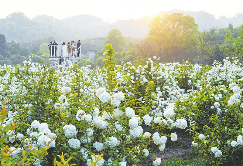 4月9日,泸州市纳溪区丰乐镇马村百花谷的琼花盛开,游客流连花间。