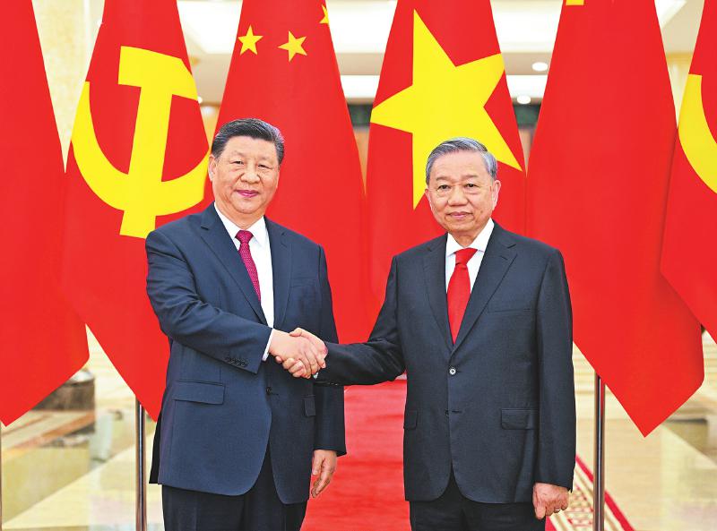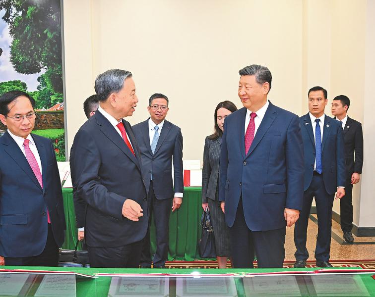 习近平强调,今年是中越建交75周年暨“中越人文交流年”。75年来,无论国际风云如何变化,双方在争取国家独立和民族解放的斗争中相互支持,在社会主义建设事业中携手并进,在推进各自现代化进程中砥砺前行,成为社会主义国家团结合作的典范。面对变乱交织的国际形势,中越两国坚持和平发展,深化友好合作,为世界带来了宝贵的稳定性和确定性。站在新的历史起点上,双方要继往开来、携手前行,赓续“越中情谊深、同志加兄弟”的传统友谊,按照政治互信更高、安全合作更实、务实合作更深、民意基础更牢、多边协调配合更紧、分歧管控解决更好的“六个更”总体目标,高质量推动全面战略合作,确保中越命运共同体建设行稳致远,为构建人类命运共同体作出新的更大贡献。
