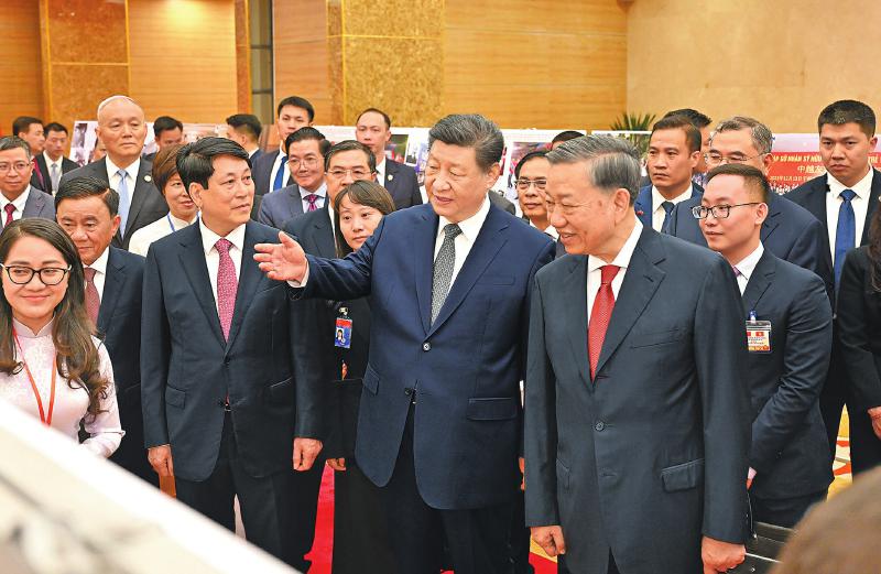 习近平强调,中越双方要以中越友好合作的稳定性和社会主义制度的优越性应对外部形势的不确定性,推动中越命运共同体航船沿着正确航道破浪前行。政治上要把住前行之舵,保持高层战略沟通,加强治党治国经验互学互鉴,共同提高党的领导能力,携手走稳走好各自社会主义道路。安全上要铸牢团结之锚,以两国外交、国防、公安“3+3”战略对话机制升格为契机,持续深化防务和执法安全合作,中方支持越方筹备好越共十四大,支持越方维护国家主权、安全、发展利益。经济上要执稳合作之楫,加强发展战略对接,落实好共建“一带一路”倡议和“两廊一圈”框架对接合作规划,深化铁路、公路、航空多维互联互通,保障产业链供应链稳定畅通,拓展5G、人工智能、绿色发展等新兴领域合作,以新质生产力赋能两国全方位合作格局。人文上要扬起友谊之帆,办好今年“中越人文交流年”系列活动,实施更多“小而美”民生项目,通过文化、旅游、媒体、地方等交流,让中越友好更加深入人心。