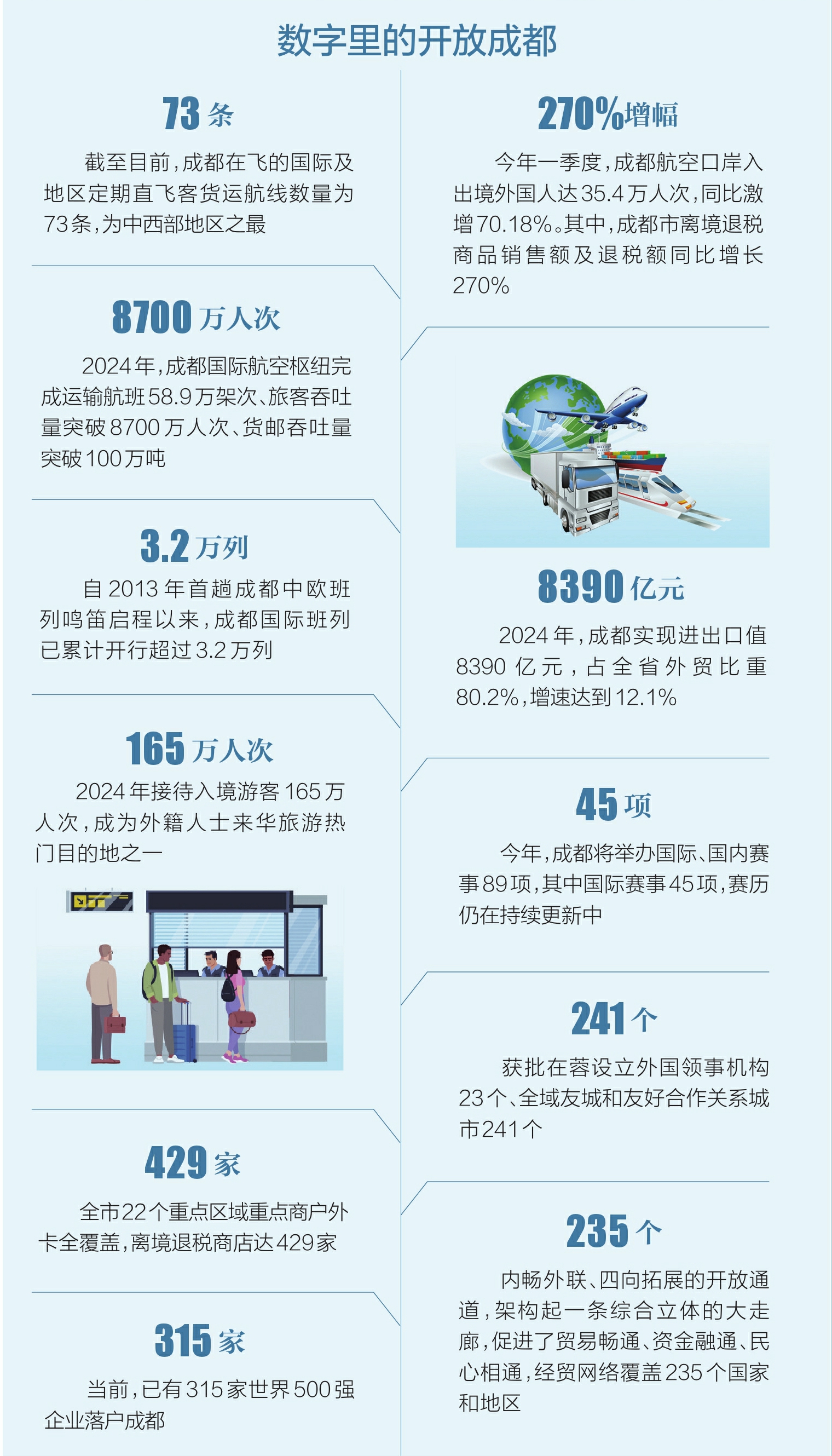 一个个不断向上攀升的数字,成为成都近年来对外开放之路越走越宽的有力印证:315家世界500强企业落户成都,成都国际班列累计开行超过3.2万列,在飞国际及地区定期直飞客货运航线数量共73条、居中西部第一……