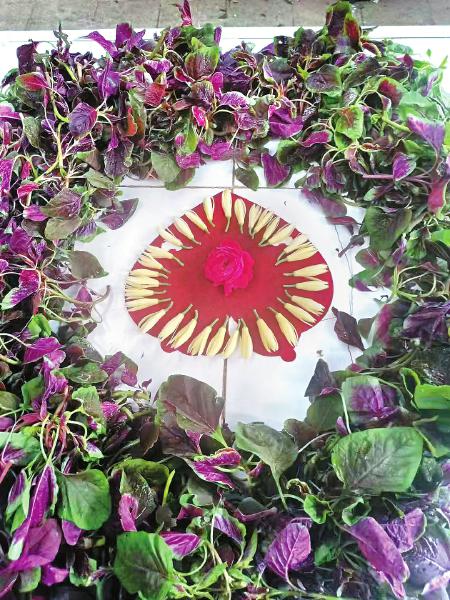 从那天开始,他每天采摘蔬菜时都会顺手摘些鲜花,并收集废弃酒瓶当花瓶。一年四季,不同的花配不同的菜,让王美成的菜摊变得丰富多彩——青菜中摆着美人蕉,芹菜配上栀子花,空心菜围着长春花,香葱簇拥三角梅……要是有人看上了他的花,他还会免费赠送。