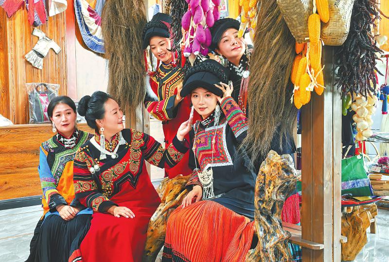 马边县城,花间刺绣专业合作社服务中心里,三两绣娘身着彝族服装,一边聊着家常,一边压条、拉丝、绣花样;展厅里彝族服饰琳琅满目,不时有游客兴致盎然轮番试穿。