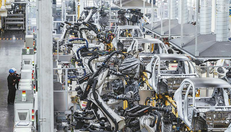 4月16日,领克汽车成都工厂焊装车间内,机械臂正焊接新能源汽车车架。该厂经过“智改数转”,整体生产的智能化、信息化、柔性化、自动化程度达到国际先进水平。