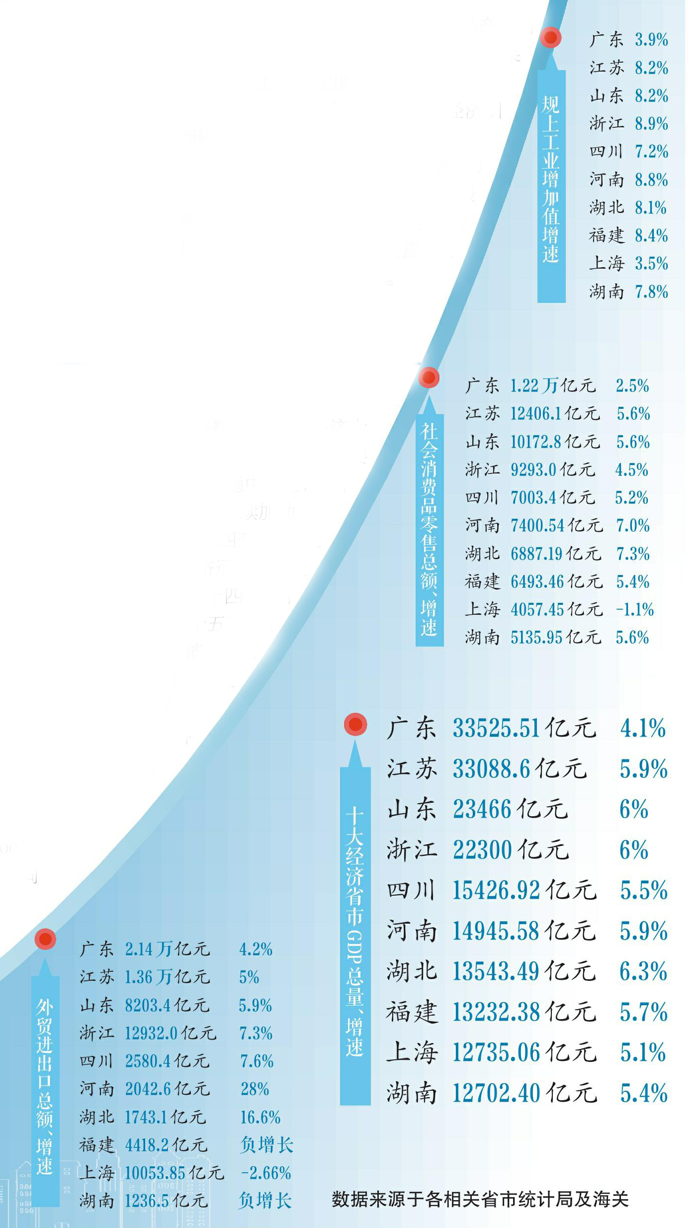 从总量看,十大经济省市可分为3个梯队——第一梯队广东(33525.51亿元)、江苏(33088.6亿元)仍是“双雄”,经济体量均突破3万亿元,合计占全国比重超过20%。经济体量大意味着高速增长的难度也更大,江苏能实现5.9%的增速实属不易。