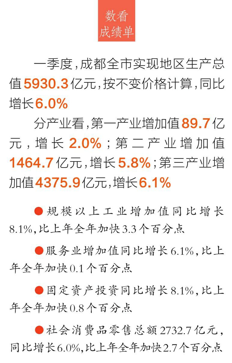本报讯(四川日报全媒体记者 蒋君芳)成都经济实现良好开局、向新向好。4月24日,成都市统计局、国家统计局成都调查队发布成都市有关经济运行数据,根据四川市(州)地区生产总值统一核算结果,一季度,全市实现地区生产总值5930.3亿元,按不变价格计算,同比增长6.0%,分别高于全国、全省0.6、0.5个百分点。