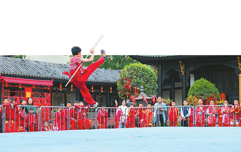4月26日,“成德眉资”武林大会邀请赛在成都市青白江区城厢古城拉开序幕。本次比赛作为成都“十二月市”四月“武市”重点活动,以“爱成都 迎世运 国风体育我传承”为主题,吸引“成德眉资”四地1200余名武林健儿同台竞技。 白桂斌 摄(C视觉)