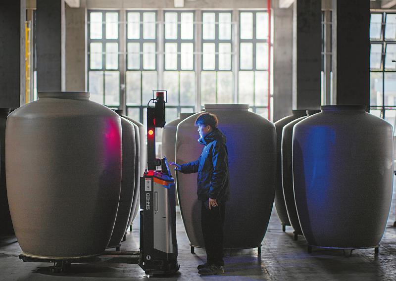 3月21日,技术工人在自贡市荣县双龙陶业制陶车间内调试AGV智能搬运机器人。