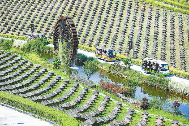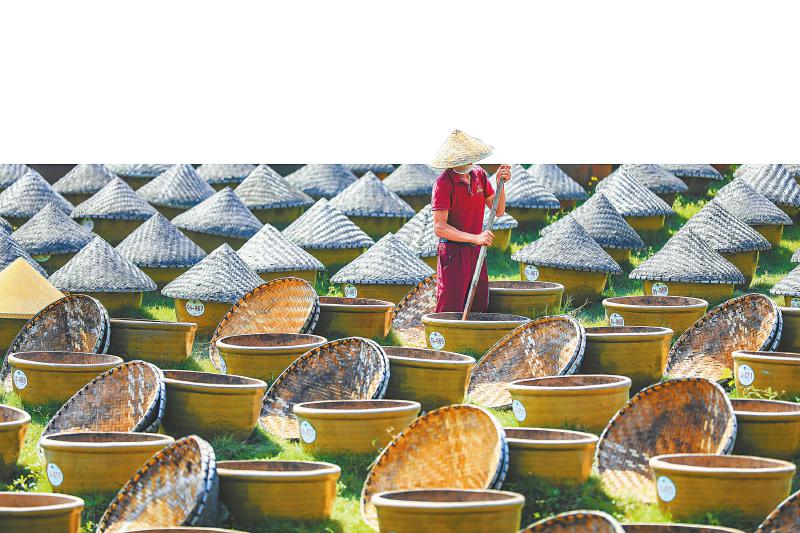 日前,合江县永兴诚酱油文化博览园正式对外开放,为即将到来的“五一”假期增添一处新的目的地。 这是中国中西部地区首个以酱油文化为主题的博览园,设有酱油文化广场、传统酱油老作坊、世界酱油文化长廊、石刻文化长廊、酱油文化博览馆等区域,研发出非遗代表性项目体验、酱油酿造过程体验等10余项体验项目,突出“传承+体验+游览”为一体的功能。 李贵平 摄 上图:工人在晒场里翻晒酱醪。下图:游客乘坐观光车体验酱香文化之旅。