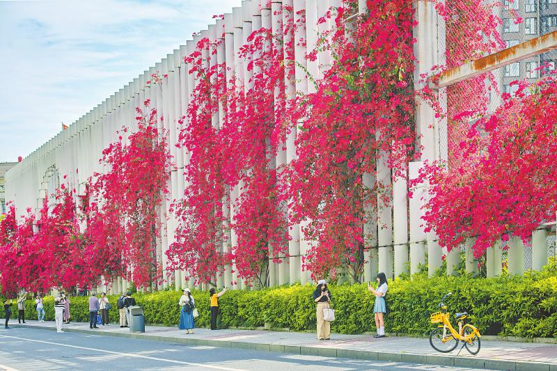 4月27日,成都石室天府中学的围墙上三角梅盛开,吸引不少市民前来打卡拍摄。周巧旻 摄(C视觉)