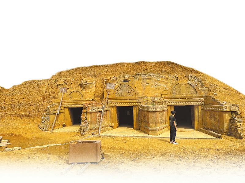 记者在现场看到,该蜀王陵是一处夫妻合葬墓。中间为蜀王陵寝,左右分别为其两位妃子的墓葬,三座墓葬在同一封土堆下。这些封土经过夯筑,现存直径约60米、高约5米。三座墓葬均为砖石结构,大小相近,结构也基本相同。