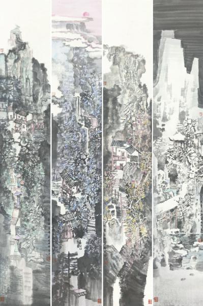作为山水画家,刘浪涛关注的不是山林小景、田园牧歌,而是用其独特的观照自然的方式,把对自然的崇拜与敬畏挥洒于纸面。在他看来,水墨的魅力在于宣纸上笔墨幻化的无穷气象,不论是具象或者抽象,都离不开形的表现。 仔细品读刘浪涛的作品,可以看出一种自由与无拘束的放松与延伸,既保留了写生而来的生动性,又与现实拉开了距离。 在这幅《四季图》中,大山穿云破雾,兼具豪壮与清幽之气,展现出一种浑厚苍茫的水墨气象。艺术家大胆渲染,笔墨酣畅淋漓,形式上注意处理虚实关系,形成了画面大虚大实的效果,令观者目光流连。(余如波)