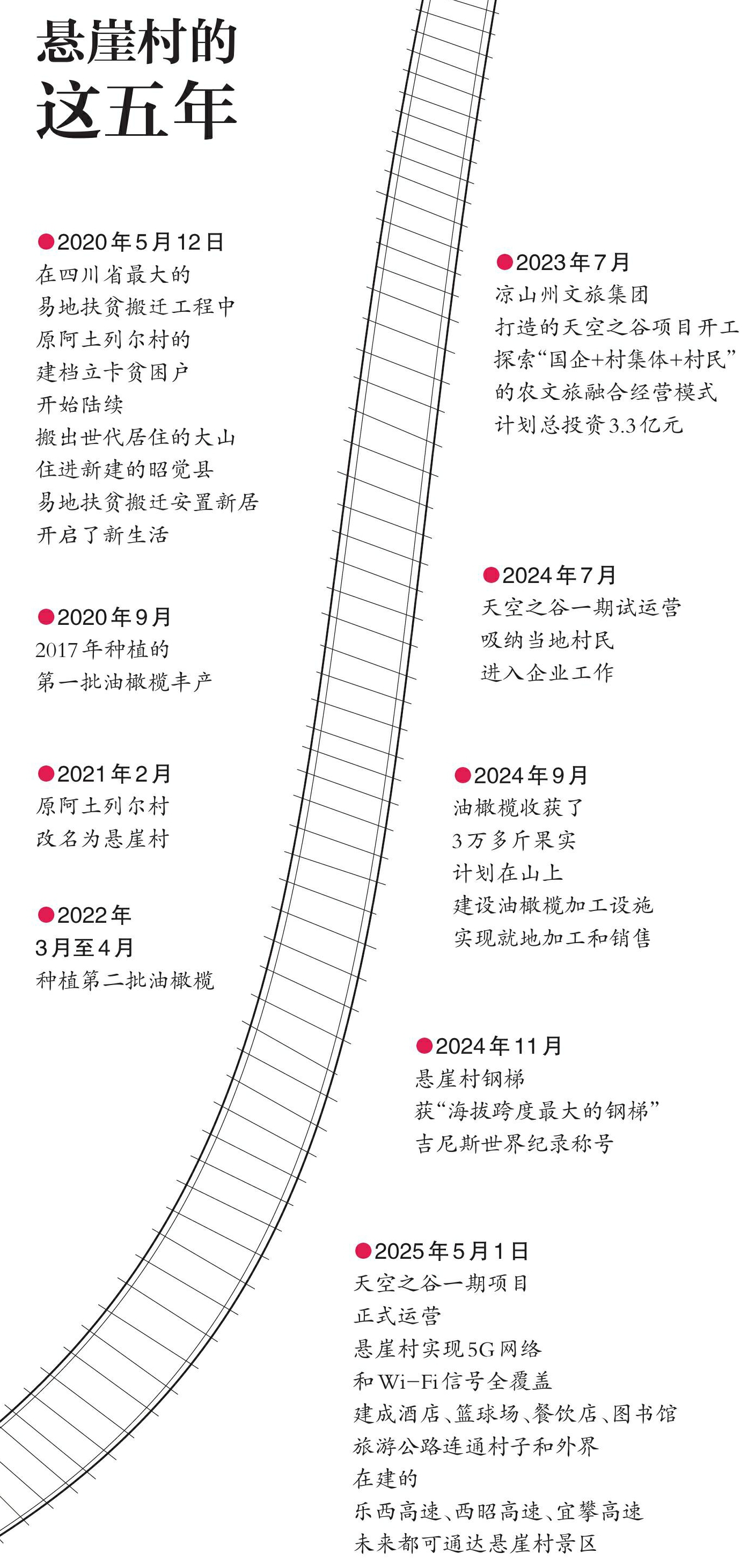 5月1日,悬崖村山下的原牛觉社旧址和温泉民宿正式开业,吸引了上千名游客前来。“未来,山上的原勒尔社旧址也会有酒店。”悬崖村第一书记兰金贵介绍,2023年7月,总投资3.3亿元的四川省重点文化旅游工程——天空之谷项目正式落户悬崖村,由凉山州文旅投资发展集团有限责任公司投资建设和运营。去年7月,一期部分项目开始试运营。