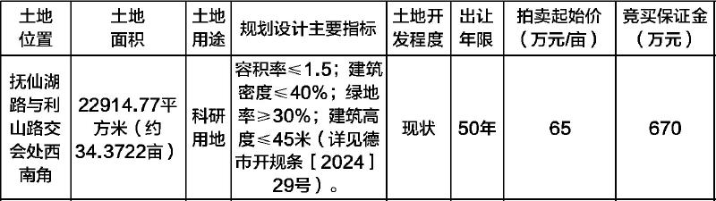 经四川省德阳市人民政府批准,德阳市自然资源和规划局决定以拍卖方式出让抚仙湖路与利山路交会处西南角的国有建设用地使用权,交易组织由德阳市政府政务服务和公共资源交易服务中心实施。现将有关事项公告如下: