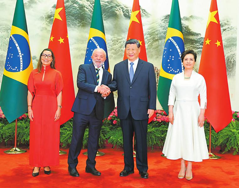 5月13日下午,国家主席习近平在北京人民大会堂同来华进行国事访问的巴西总统卢拉举行会谈。这是习近平和夫人彭丽媛同卢拉和夫人罗桑热拉合影。新华社记者 黄敬文 摄