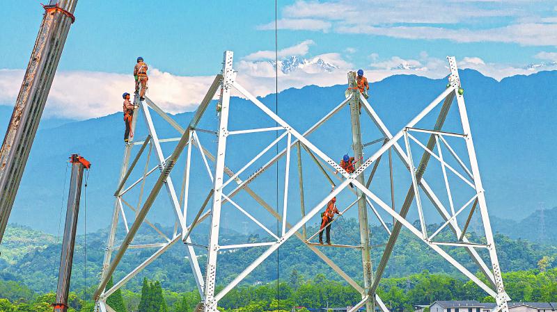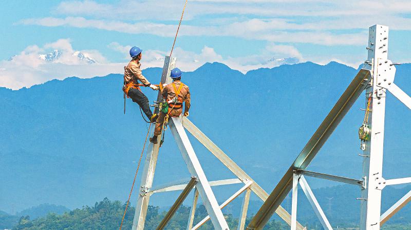 5月13日,在崇州市白头镇大雨村的成都邛崃至丹景500kV输变电线路架设施工现场,电力工人悬挂在半空架设铁塔,背后是白雪皑皑的西岭雪山。 李旭 摄(C视觉)