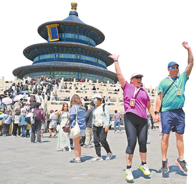 5月1日,来自澳大利亚的游客在北京天坛公园祈年殿前留影。随着中国持续优化免签政策,推出“即买即退”、便捷化支付等便利措施,越来越多的外国游客来华旅游,“China Travel”热度持续提升。 新华社记者 鞠焕宗 摄