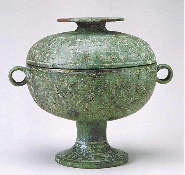 罗家坝遗址出土的文物——嵌错水陆攻战纹铜豆。