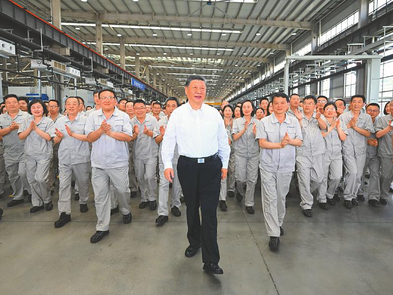 5月19日至20日,中共中央总书记、国家主席、中央军委主席习近平在河南考察。这是19日下午,习近平在洛阳轴承集团股份有限公司智能工厂考察时,同企业职工在一起。 新华社记者 燕雁 摄