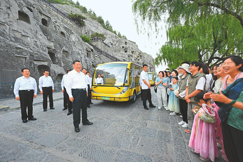 已有1500多年历史的龙门石窟,是重要的世界文化遗产。习近平来到这里,察看石窟整体布局风貌和代表性窟龛、造像,同现场的文物保护工作者亲切交流。他强调,要把这些中华文化瑰宝保护好、传承好、传播好。游客们见到总书记,都十分欣喜,纷纷向总书记问好。习近平不时同大家交流,特别鼓励小朋友们多到实地寻溯中华文化,从小树立文化自信。他指出,文旅融合前景广阔,要推动文旅产业高质量发展,真正打造成为支柱产业、民生产业、幸福产业。