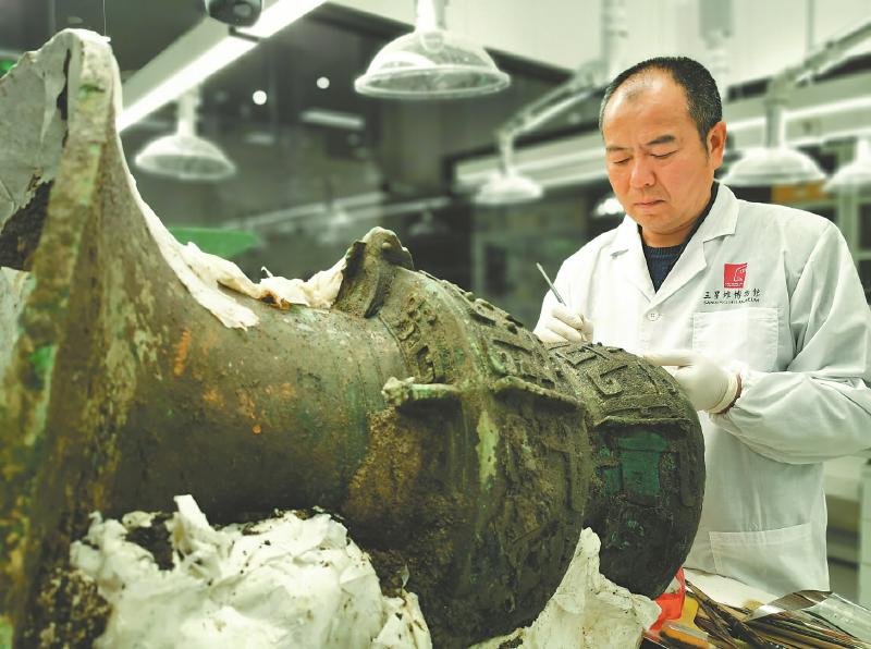 1986年,三星堆一、二号祭祀坑重见天日。彼时18岁的郭汉中,因一手陶器修复绝活被调入四川省文物考古研究所,自此与文物修复结缘。在此间,最令他骄傲的是历时6年修复一号青铜神树。“每一片残片都是历史的密码,修复不仅是技术活,更是与古人的对话。”他说。38年来,他自制近300件工具——木制卡尺、铁丝弯钩、不锈钢弧针……这些“土发明”成了破解文物提取难题的“金钥匙”。