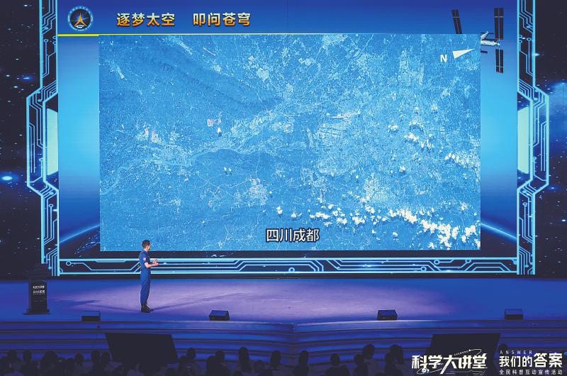 从十年“飞天”备战期间的种种极限挑战,到飞船发射时承载的巨大生理负荷,到太空俯视地球的奇妙体验,再到天宫课堂里的趣味实验……成都籍航天员叶光富娓娓道来,不但呈现了载人航天的诸多幕后,还再现了坐在石板上看飞机的少年成长为航天员的奋斗人生。尤其让现场观众惊喜的是,叶光富还带来了一张照片,是从太空俯拍的成都。叶光富说,不管是飞船视角里的故乡,还是空间站上的一抹中国红,都是自己出征太空的动力来源。