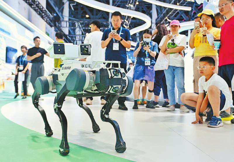 5月25日,观众在成都馆参观展出的机器狗。新华社记者 刘坤 摄