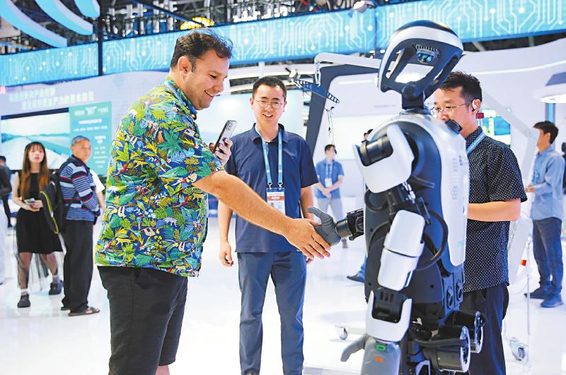 5月26日,西博会绵阳馆展出的乐聚机器人吸引外国观众握手互动。 陈冬冬 摄(C视觉)