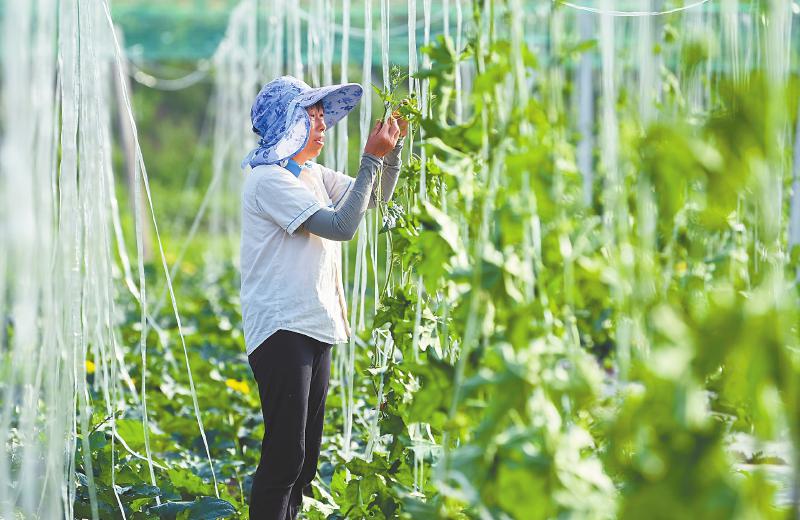 5月20日,蓬安县河舒镇柳滩社区蔬菜种植基地的农民在进行丝瓜搭蔓作业。近年来,蓬安县通过“公司+基地+农户”的模式,大力发展特色蔬菜产业,形成了从种植、购销、加工到运输的产业链条,带动农民增收致富。刘永红 摄(C视觉)