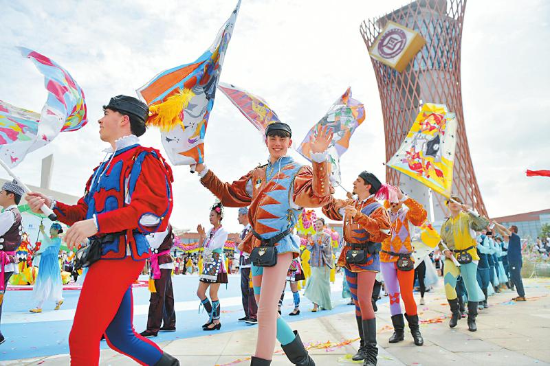 当开幕式巡游正式开启,现场响起阵阵欢呼。51支国内外非遗表演队伍参演,在“江河共润”“六合同风”“寰宇和鸣”“生生不息”4个篇章中,展示了全世界不同国家和地区非遗代表性项目。潮汕英歌舞威猛豪放,意大利旗舞优雅灵动,四川清音婉转悠扬,当非遗巡游突破地域界限,不同文明的对话便有了具象化的载体。