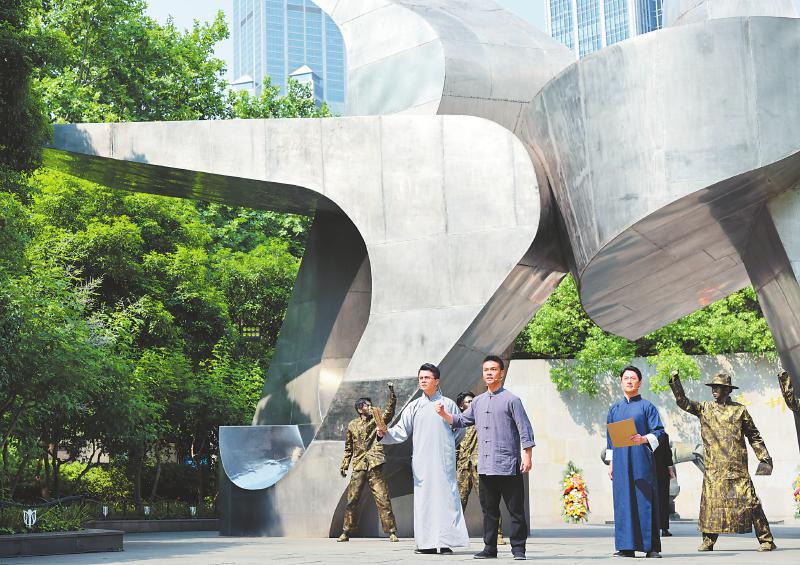 • 五月三十日,演员在进行《新生的力量》雕塑舞蹈演绎和情景诗朗诵。当日,上海市总工会纪念五卅运动一百周年主题活动在位于上海人民广场的五卅运动纪念碑广场举行。新华社记者 方喆 摄