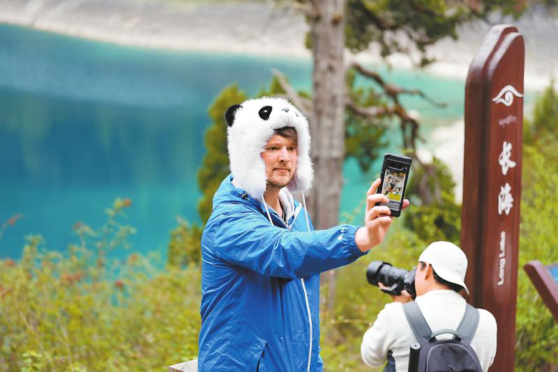 5月30日,外国游客用手机现场给朋友分享九寨沟的美景。
