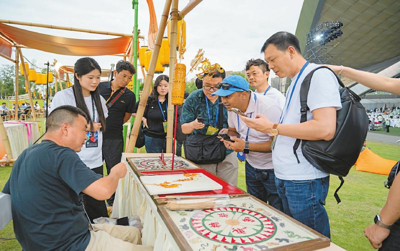 5月28日,外国游客在成都体验四川传统手工艺“倒糖饼儿”。