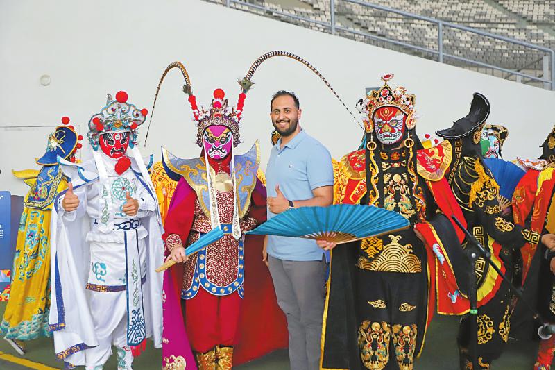 5月28日,外国游客与参加“成都之夜”川剧变脸表演的演员合影。