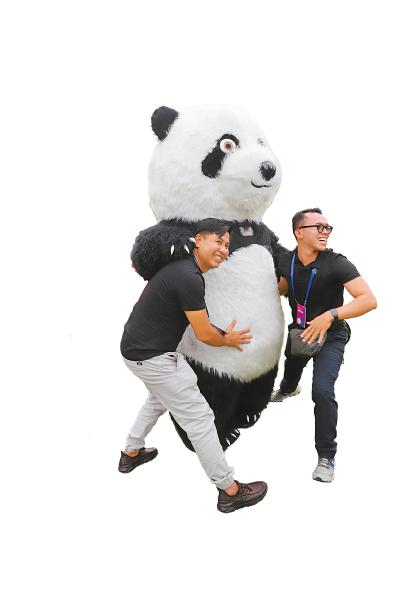 5月28日,外国游客在成都露天音乐公园拥抱欢迎他们的“熊猫迎宾天使”。