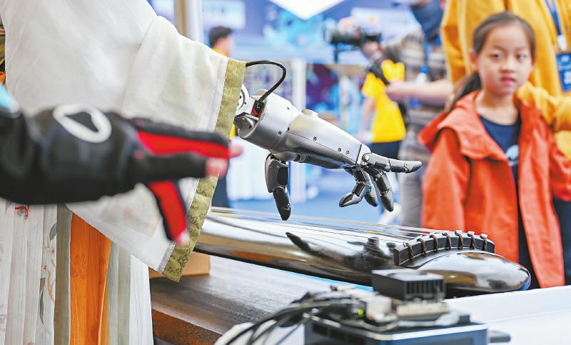 6月2日,“世界机器人嘉年华”活动在武汉花博汇景区举行。本次活动以近百台机器人为表演核心,机器人乐队、机器宠物、化妆机器人等陆续亮相,游客可以近距离与机器人接触,感受科技赋能文化与生活的魅力。 上图:游客观看机器人演奏古琴。右图:游客与机器人互动。 新华社记者 杜子璇 摄