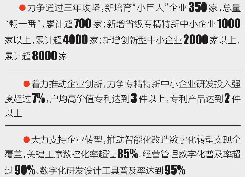 《行动计划》提出,力争通过三年攻坚,新培育“小巨人”企业350家,总量“翻一番”,累计超700家。着力推动企业创新,力争专精特新中小企业研发投入强度超过7%。大力支持企业转型,推动智能化改造数字化转型实现全覆盖,关键工序数控化率超过85%、经营管理数字化普及率超过90%等。