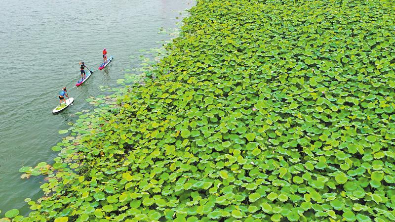5月30日,参加2025观音湖“绿水青山”中国休闲运动挑战赛的运动员在四川省级美丽河湖优秀案例遂宁市圣莲岛进行划桨比赛,置身绿水青山间,共赏水与城相融、人与景共生的生态之美。 钟敏 摄(C视觉)