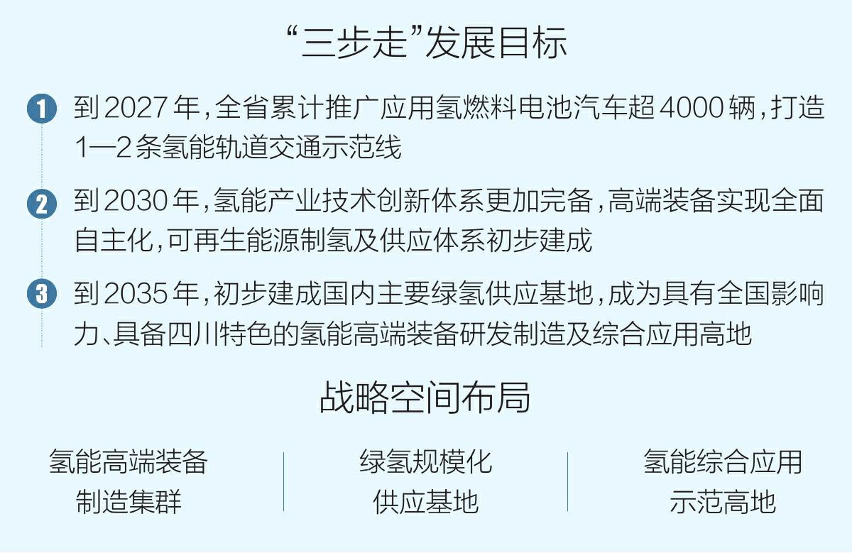 总体看,《四川省氢能产业发展规划(2021—2025年)》提出的“到2025年,四川氢能产业发展初具规模”目标已实现。在此基础上,新规划的发展目标更加具体,提出2027年、2030年、2035年“三步走”发展目标:到2027年,全省累计推广应用氢燃料电池汽车超4000辆,打造1—2条氢能轨道交通示范线;到2030年,氢能产业技术创新体系更加完备,高端装备实现全面自主化,可再生能源制氢及供应体系初步建成;到2035年,初步建成国内主要绿氢供应基地,成为具有全国影响力、具备四川特色的氢能高端装备研发制造及综合应用高地。
