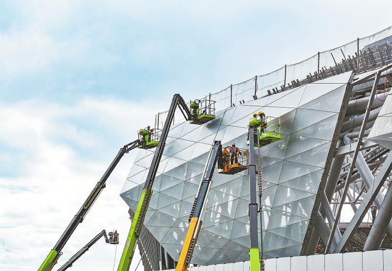 6月8日,在川渝广安共享体育基地项目奥体中心建设现场,建设者正进行高空作业。进入6月,广安市项目建设按下快进键,各施工现场呈现出一片热火朝天景象,力争实现时间过半、任务过半。 邱海鹰 摄(C视觉)